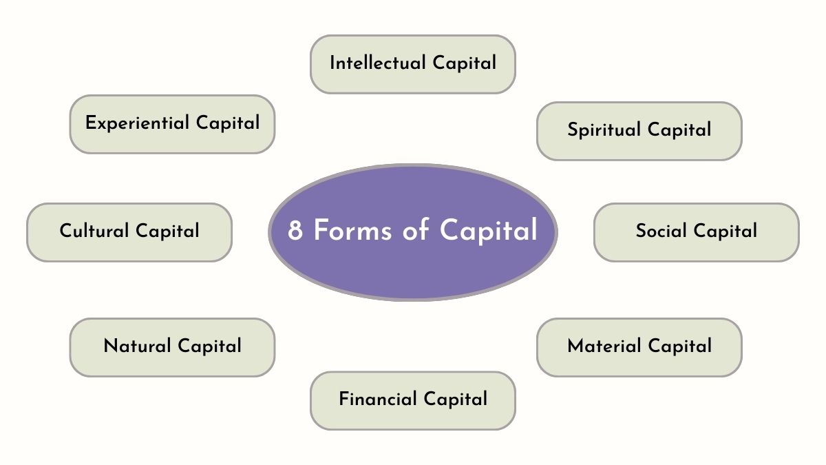 To truly thrive as individuals and communities, we must broaden our understanding of what constitutes value. Several frameworks help illustrate this clearly. One perspective-shifting model, developed by Ethan Roland of Appleseed Permaculture, identifies eight distinct forms of capital: (also spoken to well in this article by 7th Generation Design)